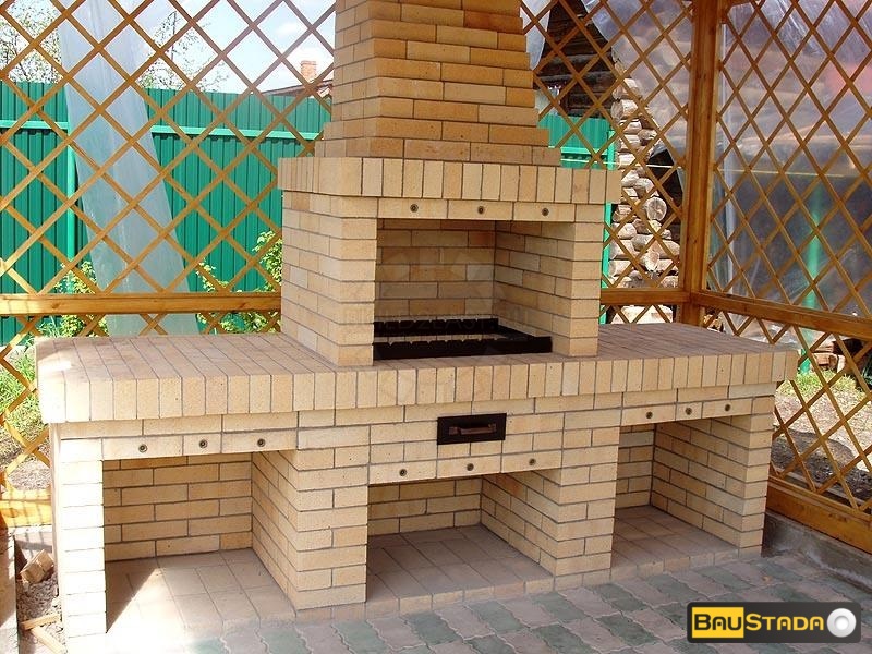 Строятся барбекю из кирпича, они менее сложные, чем русские печи, но доверить строительство лучше профессионалам. Барбекю имеет внушительные размеры и будет заметным объектом на приусадебном участке. При строительстве необходимо это учесть и разработать проект в едином стиле с архитектурой дома или беседки. Работы начинаются с возведения фундамента, так как вес конструкции значителен. Следующие этапы строительства включают в себя: